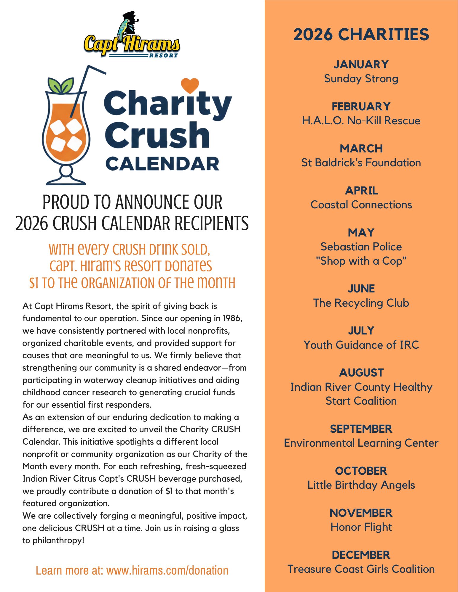 The Charity Crush Calendar has been a staple of Capt. Hiram’s Resort’s community outreach efforts since 2018. The Crush Calendar is comprised of twelve different nonprofits and community organizations – one for each month of the year. Each month $1 from every Capt’s Crush, our signature cocktail, is donated to the featured organization. Once the donations have been collected, representatives from both Capt. Hiram’s and the featured non-profit meet for a check presentation and photograph. From cleaning our waterways to supporting community healthcare to building affordable housing for families, we are committed to “crushing” as many goals as possible!